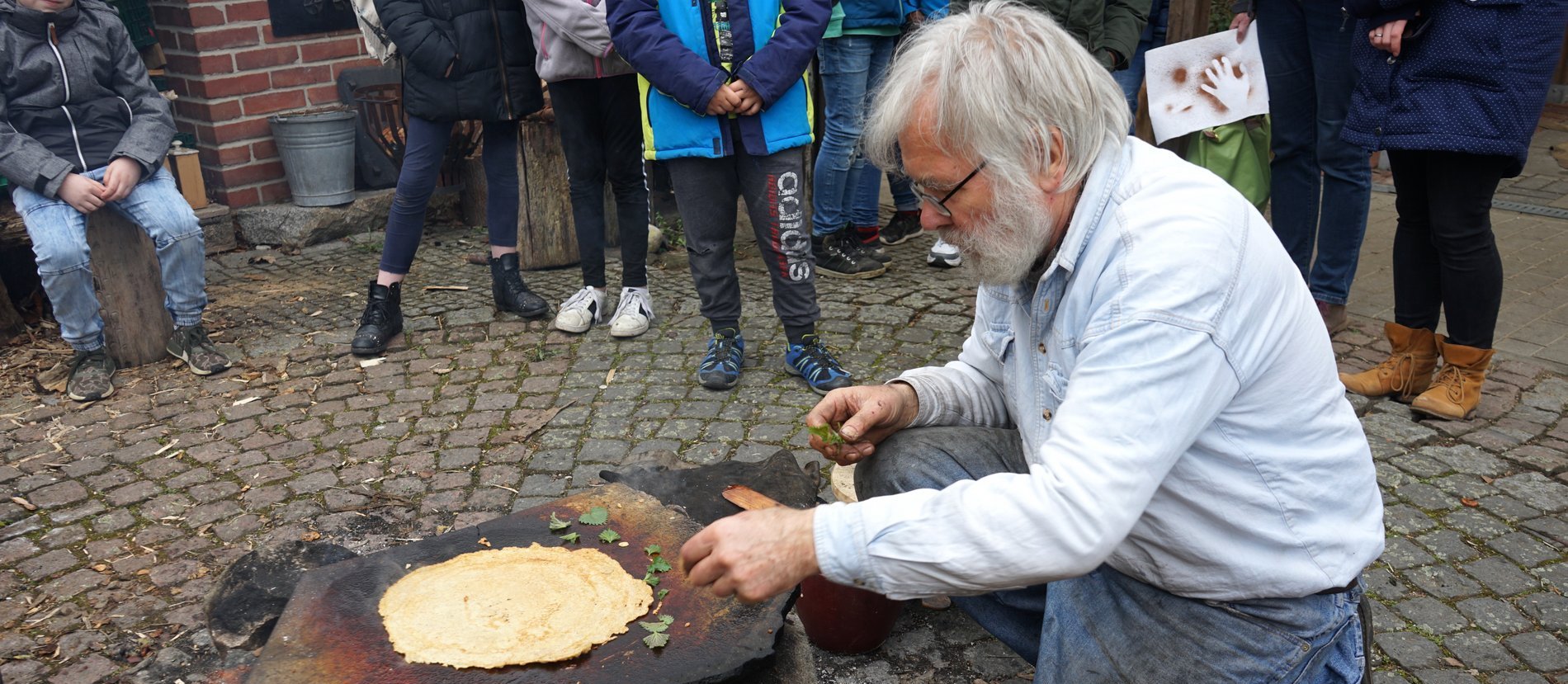 Um die Wartezeit zu verkürzen, legt der renommierte Steinzeitforscher einige Brennnesselblätter auf den Stein über dem Feuer. Wir dürfen die angerösteten Blätter noch heiß naschen – köstlich! Derweil holt ein Schüler heiße Steintöpfchen mit Deckeln vorsichtig vom Rand des Feuers zu Dr. Ringots steinzeitlichem Küchentisch. Darin ist die Beeren-Nuss-Füllung für die Crêpes aus selbstgemahlenem Mehl. Auch vom Crêpe darf ich probieren – eine kulinarische Offenbarung!