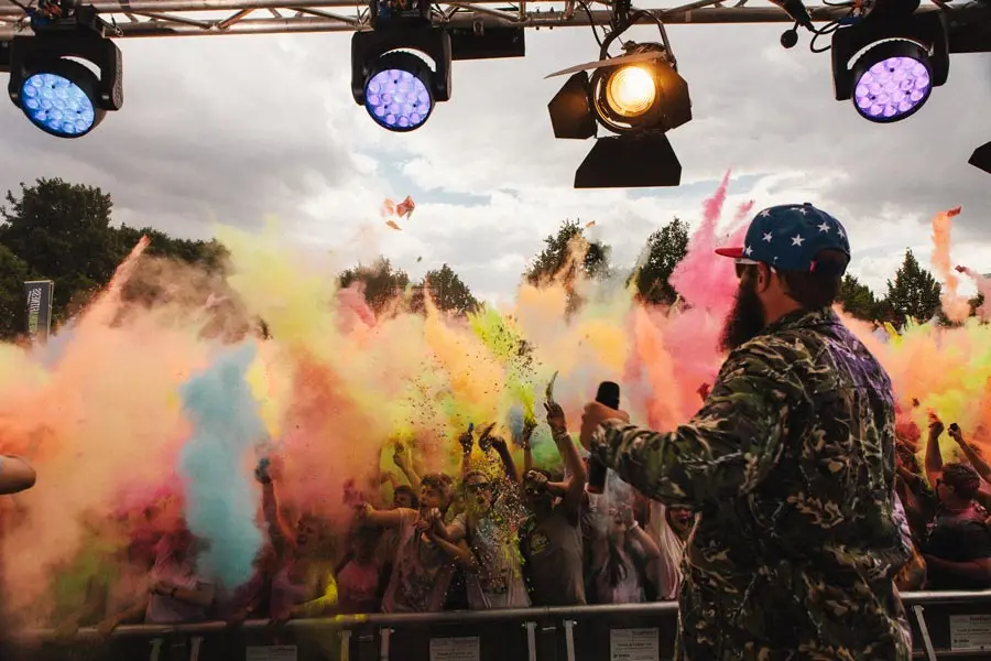 Das Festival hat seinen Ursprung im traditionellen hinduistischen Holi-Fest, das jährlich am ersten Vollmondtag des Monats Phalgun (Februar/März) in Indien gefeiert wird. „Beim Holi-Fest zelebrieren Hindus traditionell die zeitlich auf das Festival begrenzte Aufhebung des strengen indischen Kastensystems“, erklärt Tim. „Dann feiern plötzlich Manager mit Haushältern, etwas, das unter normalen Umständen dort nicht möglich wäre.“ Die Farbe mache alle gleich und hebe Klassenunterschiede auf.