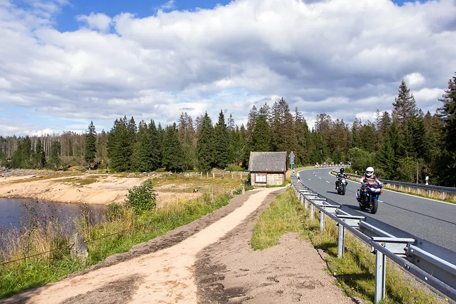 Weiter geht’s mit dem weißen Blitz. Über die Weißwasserbrücke führt der Weg nach Altenau. Nun werden die Kurven enger und der Fahrspaß größer. Die dunklen Fichtenwälder spenden auch bei strahlendem Sonnenschein Schatten, hier ist die Luft feuchter und kühler, es duftet würzig nach Wald. Doch schon in der nächsten Kurve ist es wieder sonnig und warm, so wechseln sich die Eindrücke ab, die man nur auf dem Motorrad in dieser Art erleben kann!