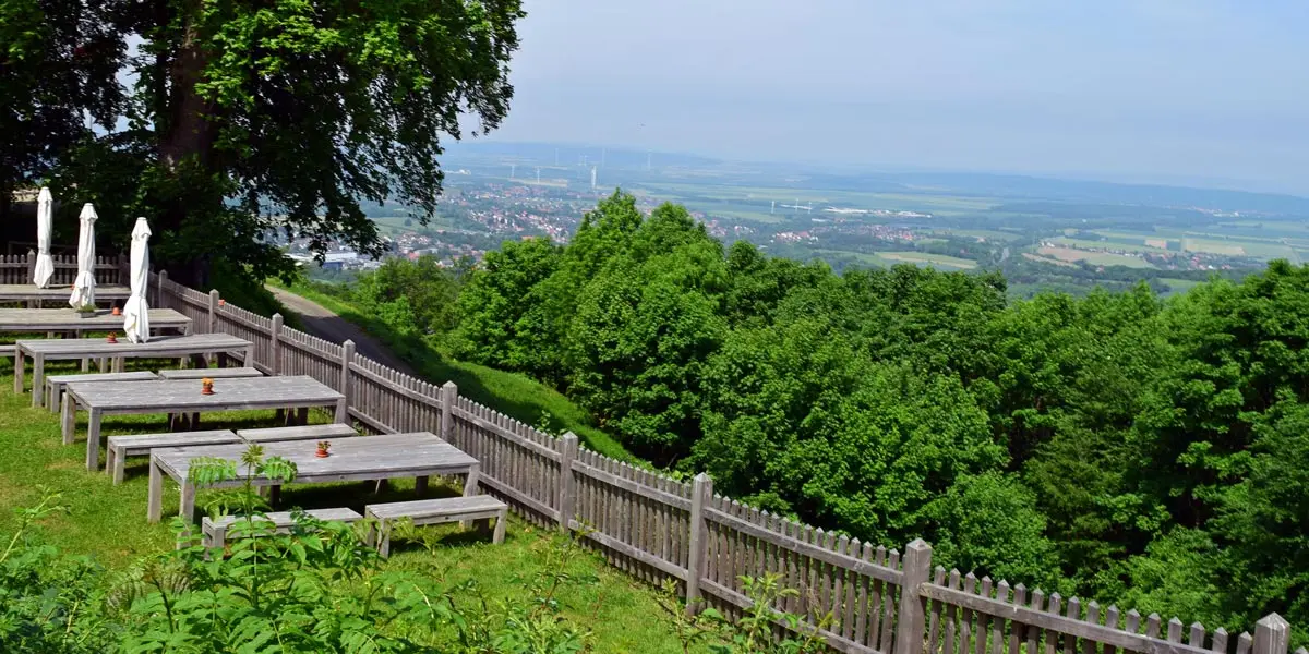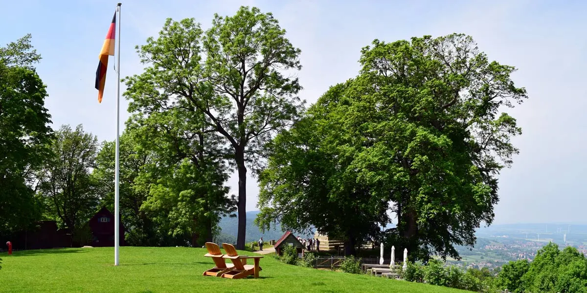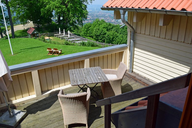 Aber das ist nicht die einzige Besonderheit der Hotelanlage. Der Ort hat sein ganz eigenes Flair mit den tausend Jahre alten Überresten der Burg im Rücken und den imposanten alten Bäumen. Die Bergstation der historischen Seilbahn ist nur wenige Schritte entfernt. Blickachsen ins weite Land und auf die nächstgelegenen Harzgipfel leisten ihren Beitrag.
