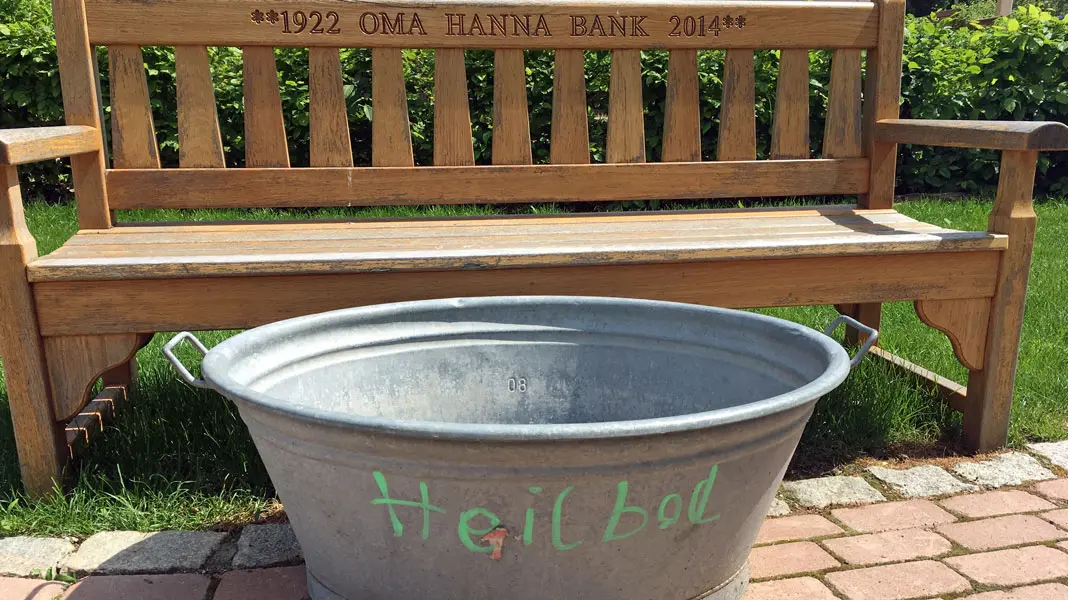 Im Restaurant fallen mir die auf Glas geprägten poetischen Auszüge aus dem Grundgesetz auf, die hier wie Kunstwerke an Wänden und Türen platziert wurden. Und auch dem Wellness-Boom wird Tribut gezollt – natürlich mit einem Augenzwinkern: Da wird die alte Zinkwanne mir nichts, dir nichts zum „Heilbad“ umfunktioniert. Und die erholungssuchenden Gäste dürfen wie im Wellness-Hotel im Bademantel ins Schwimmbad fahren – nur dass hier der Pool die Sole-Therme im Tal ist und die Fahrt mit der Seilbahn angetreten werden muss. „Unser Fahrstuhl überwindet 200 Höhenmeter und unser Liftboy ist Bergbahner“, schmunzelt Junicke.