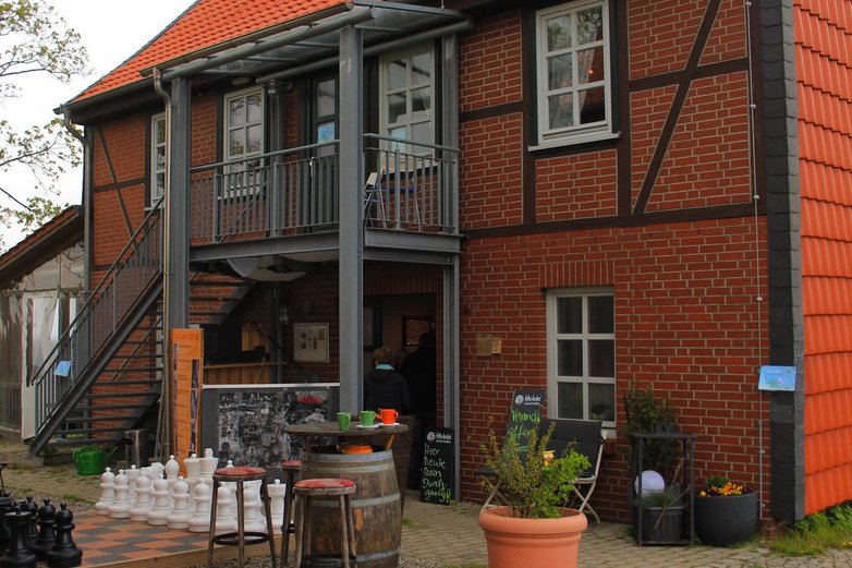 Den E-Bikes im Schneckentempo hinterher, schaffte auch ich es schließlich zum Café, dass laut meiner Mitfahrer regionale Bekanntheit genießt. Nach dem ersten Schnaufen (wirklich – fahrt niemals mit einem Chopper auf Radtour) verstand ich auch warum. Das Café steht auf einem kleinen Hügel und ermöglicht eine fantastische Sicht ins Tal. Liebevoll wurde die alte Mühle daneben zu einer Art kleinem Museum aufgearbeitet. Über dem Café befindet sich zudem seit 2017 die „Heimatstube“ – ein sorgfältig hergerichtetes Sammelsurium an Dingen aus vergangener Zeit. Hier wird uns eine Menge über Traditionen, Alltag und das Leben vergangener Tage erzählt und anschaulich gezeigt. Ein anderer Teil unserer Gruppe hat sich einen der letzten Plätze im voll besetzen Wintergarten des Cafés ergattert und genießt ein Stück des berühmten selbst gebackenen Kuchens des Mühlencafés. Normalerweise finden im Café auch häufig Konzerte und andere kulturelle Veranstaltungen statt. Just an diesem Tage jedoch ist die Stube für eine private Feier geschlossen.