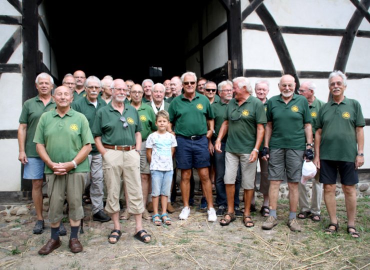 Die Herren wissen gleich, worauf es ankommt und so formieren sie sich vor dem neu mit Reet gedeckten Heimatmuseum zum Gruppenfoto. Gut gelaunt wird gescherzt, wer denn nun in der ersten Reihe stehen darf. Die Radler mit den langen Hosen oder die mit den braunen Beinen? Wieso, denke ich kurz … na, wegen der Altmännerbeine. Einer sticht aus der Reihe heraus: Es ist der Enkel des Ortsbürgermeisters Wolfgang Brandes, der siebenjährige Nick. Er guckt spitzbübisch zwischen den Herren hervor und ist sichtlich stolz, mit dabei sein zu dürfen. Wie sich später herausstellt, fährt er aber nicht mit der Radlertruppe mit, sondern geht mit seinem Opa angeln, weil Ferien sind.