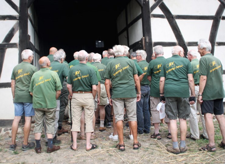 Mich beeindruckt das Outfit der Gruppe: Alle tragen ein grünes Vereins-T-Shirt und der Clou – die Shirts sind auf dem Rücken mit „tramp tau“ bedruckt. Das nenne ich mal Marketing! Also müssen mir die Altersblonden ihre Rücken zeigen, was sie gern tun. Danach aber kommt schon Unruhe auf, die Herren wollen los – es stehen noch 35 Kilometer auf dem Programm und wird gen Mittag nicht kühler werden. Wo geht’s denn hin? „Wir fahren nach Wahle bei Peine zu einem 80. Geburtstag.“ Na dann – aber Halt – der Ortsheimatpfleger Bodo Fricke möchte mir noch etwas zum Heimatmuseum erzählen. Er nimmt mich mit ins kühle Innere des alten Bauernhauses von 1639. Die anderen warten etwas ungeduldig unter der großen Eiche am Museum.