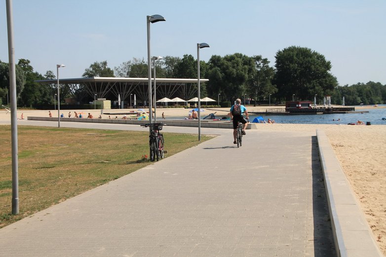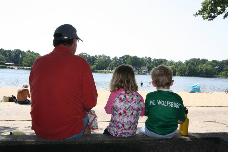 Weiter geht es zum Fitnessplatz, an dem ein Sportfan trotz über 30 Grad trainiert. Meine Kinder klettern aber nur ein bisschen auf den Geräten herum, bevor es auf den benachbarten „richtigen“ Spielplatz, genannt Spielpark, geht. Ein bisschen aufs Kletternetz, ein bisschen balancieren. Aber bei diesem Wetter lockt einfach das Wasser, daher biegen wir rechts ab und gehen am Hotel vorbei in Richtung Ufer. Es ist später Vormittag. Ein paar Familien mit Kindern und weitere Personen jeden Alters sind zu sehen. Viele schwimmen, einige haben sich mit einem Buch ein schattiges Plätzchen gesucht und genießen die Ruhe.