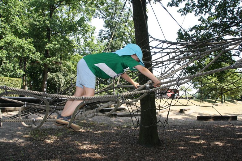 Bevor es wieder nach Hause geht, machen wir noch einen Abstecher auf den Spielplatz Bodenlos, direkt gegenüber des Klettergartens. Nicht nur, weil die umliegenden Bäume viel Schatten spenden, ist er am heutigen Tag ein toller Abschluss. Er bietet einen Parcours aus Stationen zum Klettern oder Balancieren. Zwischen diesen Stationen ist es die besondere Herausforderung, nicht den Boden zu berühren. Tolle Idee, die uns sofort an Pippi Langstrumpf und ihr Spiel „nicht den Fußboden berühren“ erinnert.