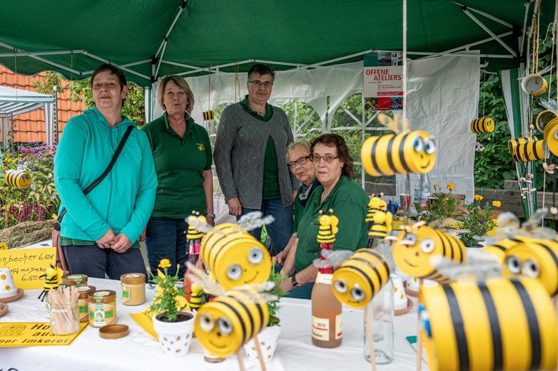 Schon auf dem Weg vom Parkplatz zum Hof sind mir viele Leute mit Pflanzen entgegen gekommen. Gegenüber von Herrn Zwargs Stand gibt es das bienenfreundliche Grün und weitere Blühpflanzen bei Imke Grotewold, LandFrau im Kreisvorstand und Eigentümerin des PflanzenEck Wense, zu kaufen. Und allgegenwärtig ist die Biene: Ganz präsent ist sie als Wappentier der Peiner LandFrauen, aber auch als Dekoration für den Garten und in Form von leckerem Honig ist sie zu bestaunen. Hinter einer Glasscheibe kann sogar ein kleines Bienenvolk beobachtet werden.