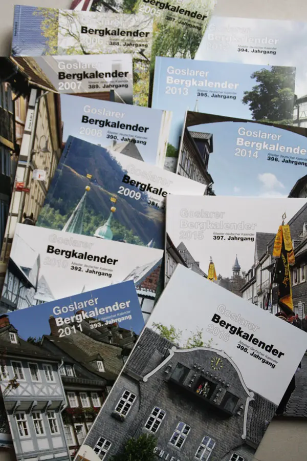 Er erzählt gern und enthusiastisch über das ganz besondere Kalenderprodukt. Seit sage und schreibe 399 Jahren kreisen dessen Themen um Goslar und seinen Bergbau. 1619 gegründet, gilt er als der älteste Kalender Deutschlands. Ich erfahre vom Stadtarchiv Goslar, dass es sogar noch einige Schätze aus dem 17. Jahrhundert hütet, zum Beispiel die Ausgaben von 1627, 1643 und 1644 sowie die von 1677. Eine durchgängige Sammlung aller Exemplare gibt es allerdings nicht.