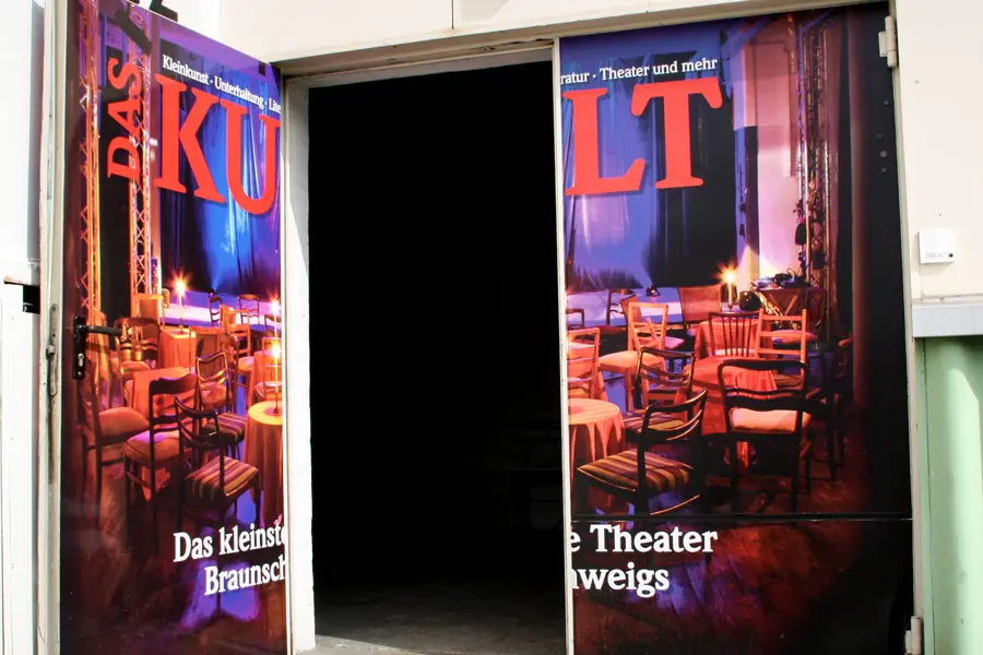 Das KleinkunstUnterhaltungsLiteraturTheater (Das KULT) war geboren. Die Bühne bestand aus einem schwarzen PVC-Belag, eine Traverse mit Licht sorgte für selbiges, der Vorhang hing und die Stühle waren ein sympathisches Sammelsurium von geschenkten Stühlen – wie auch heute noch. Für die nächsten anderthalb Jahre war das KULT ein neues Refugium der Kleinkunst in Braunschweig. Nun ja, kurz erzählt, der Mietvertrag lief aus und wurde nicht verlängert. Also musste ein neuer Raum her.