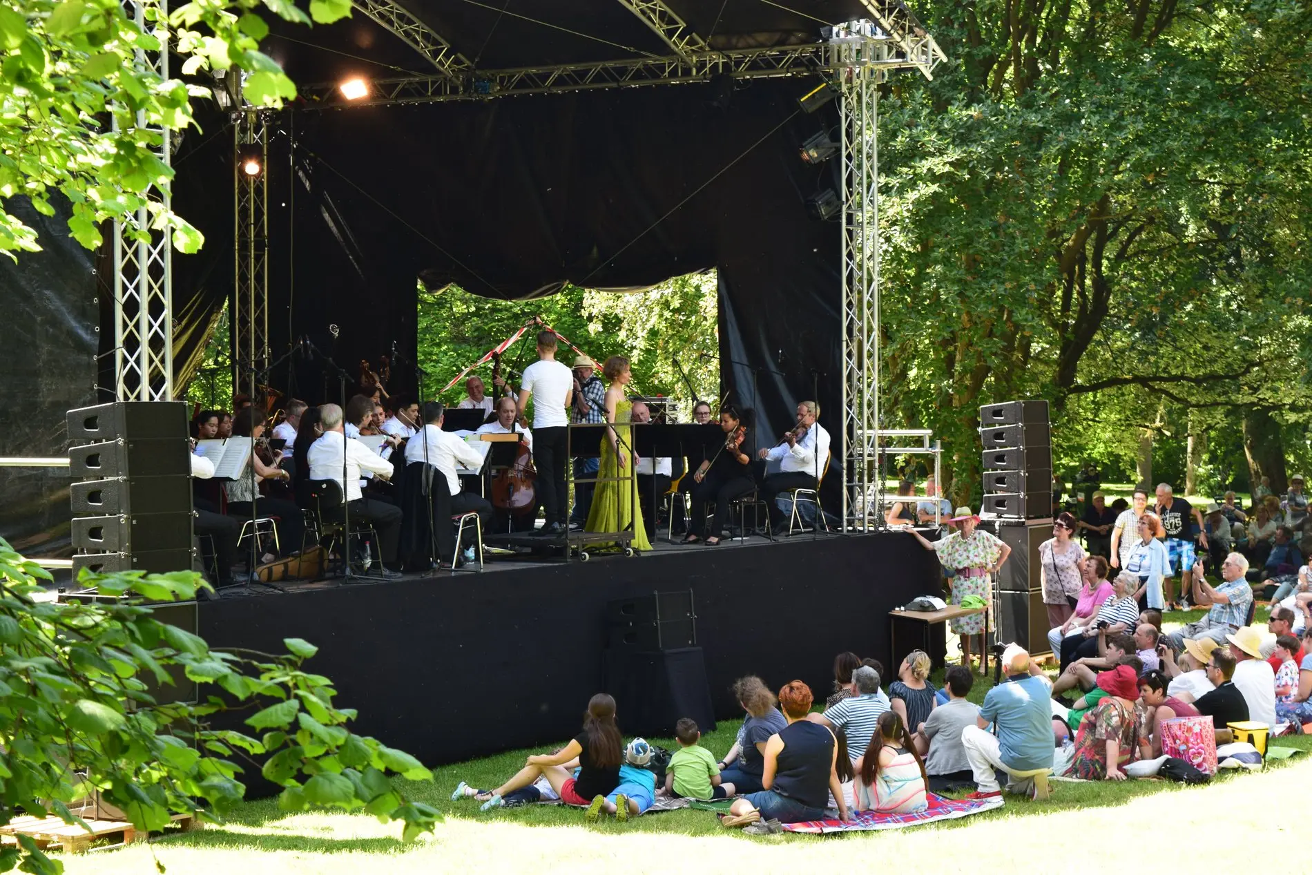 Die große Sonnenwiese direkt vor der Bühne – sie bleibt leer. So spielt das Braunschweiger Staatsorchester ungewohnt weit weg von seinem Publikum. Über mangelndes Interesse kann sich das routinierte Orchester allerdings nicht beschweren: Über 1.000 Klassikfreunde und Picknick-Begeisterte zieht es auf Einladung des Vereins Braunschweigische Landschaft am 2. Juni in die Salzstadt.