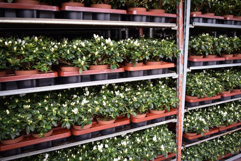 Von den 70.000 bis 80.000 jährlich kultivierten Azaleen reisen allein schon 60 Prozent zu den großen Blumenversteigerungen nach Holland. „Und zwar blühend“, so Dettmer, was die Anforderungen an die Pflanzen in puncto Haltbarkeit und Robustheit natürlich erhöhe.