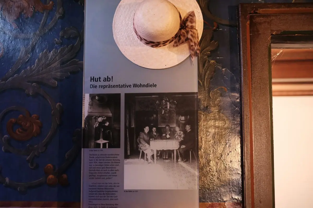 Wir stehen in der Eingangsdiele des Hauses, das Tageslicht von außen bringt die farbigen Bleiglasfenster zum Leuchten und malt ein buntes Muster auf die Bodenfliesen. Das Besondere des Hauses, erklärt mir Christoph Mayer gleich zu Beginn, ist die originale Ausstattung der Räume. Alles, was hier steht, hängt und liegt, wie Möbel und Einrichtungsgegenstände, aber auch Malereien an Decken, Wänden und Böden und Kachelöfen stammt von den Bewohnern des Hauses. „Es wurde nichts hinzugekauft.“ Der bunte Stilmix, der sich daraus ergibt, zeigt, wie jede Generation ihre Spuren hinterlassen hat, ein Jugendstil-Kachelofen, das Hochzeitsdatum in den bunten Fenstern, die geblümte Tapete im Wohnzimmer. Schlichte Stelen erläutern jeweils die Funktion des Raumes, zeigen Fotos oder spielen Audiodokumente ab.