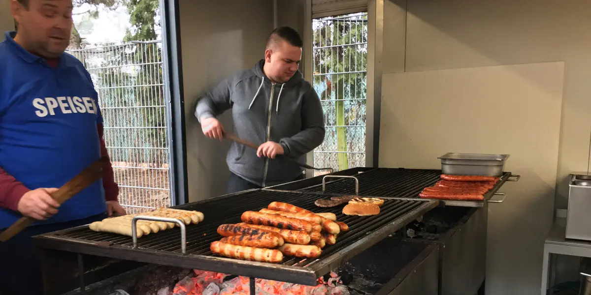 Unsere Verabredung um 12.00 Uhr schaffen die beiden Sauerländer nicht. Die Parkplatzsuche dauert länger. Also nehme ich zur Entgegenwirkung der absehbaren Kalorienunterversorgung noch eine Bratwurst vom Holzkohlegrill ein. Angesichts des schwitzenden Wurstdrehers denke ich mir: „Coole Jobs gibt’s hier rund um so’n Eintracht-Spiel!“