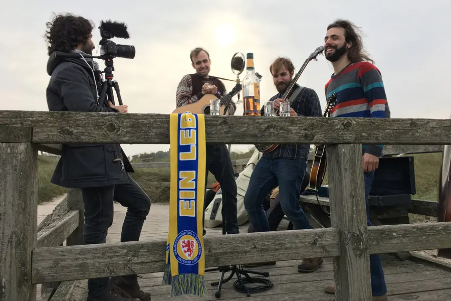 Das wird mir am nächsten Morgen klar, als ich wie immer am Matchday voller Elan und mit leichter Anspannung früh in den Tag starte und bereits um 8.00 Uhr die erste Kanne Kaffee koche. Ich hänge Schal und Mütze auf den Balkon und mache ein erstes Foto. Clemens grummelt: „Leg’ dich wieder hin, du Spacko …“ Frühstück gibt’s ab 10.00 Uhr bei TWANG-Sänger Henrik, Jan und Maren im Appartement: Viel Rührei für alle dient als gute Grundlage für Festival-Tag Nummer zwei … Henrik verkündet seinen Tipp: „1:1, ist doch klar.“ Gegen 12.30 Uhr sind wir wie im Vorjahr mit Hermann und Jörg in der hiesigen Sportsbar „Heimspiel“ verabredet – bleibt mir also noch Zeit genug dafür, die übliche vorbereitende Radtour zum Heimspiel durch einen kontemplativen Strandspaziergang zu ersetzen. Dabei begegnet mir tatsächlich eine Gruppe Strandreiter – so ein kitschig-schönes Matchday-Erlebnis ist auch eher selten.