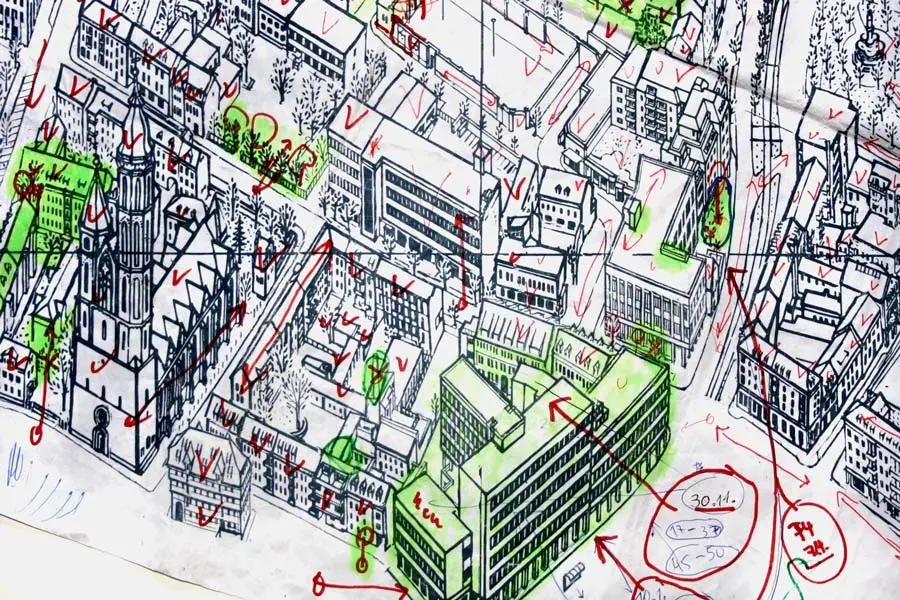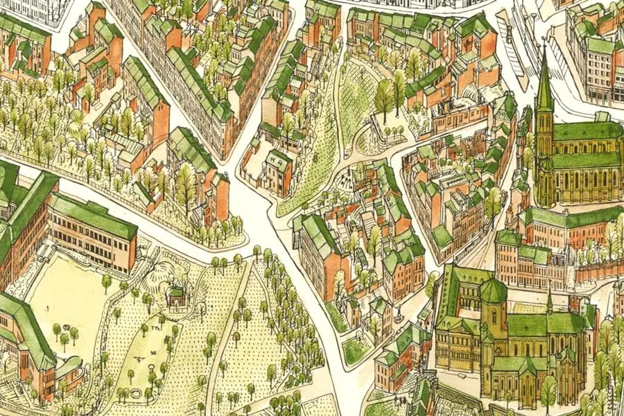 Die Gebäude werden in der Zeichnung überhöht dargestellt. Dadurch sieht der Betrachter mehr von den Häuserfassaden, die die urbane Struktur unterstreichen und es entsteht eine dreidimensionale Wirkung. Die Bildpläne sind so viel anschaulicher als „normale“ Stadtpläne und erinnern mich an die Wimmelbilder aus meiner Kindheit: Es gibt immer etwas Neues zu entdecken.