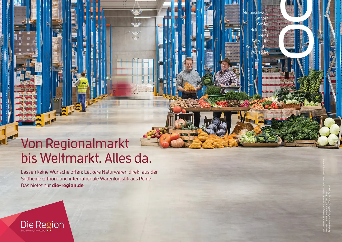 Aus der Region in die Welt. Und umgekehrt: Aus der Welt in die Region. Unsere Städte und Landkreise bieten beste Voraussetzungen für eine florierende Wirtschaft – sowohl für die lokale Erzeugerlandschaft als auch für den internationalen Warenverkehr. Es ist eben #allesda in der Region für´s erfolgreiche Business. Und davon profitieren insbesondere wir als Verbraucher: Leckere Naturwaren gibt es hier direkt vom Feld auf unsere Teller und der Bedarf an Produkten von überall her ist stets gedeckt. Auf unserem Kampagnenmotiv haben wir stellvertretend für die Vielfalt der Märkte die Landwirte Ernst Lütje und Hubertus Volk mit ihrem Obst und Gemüse aus der Südheide im Logistikzentrum von DSV in Peine abgelichtet. Regionalmarkt und Weltmarkt ganz dicht beisammen.