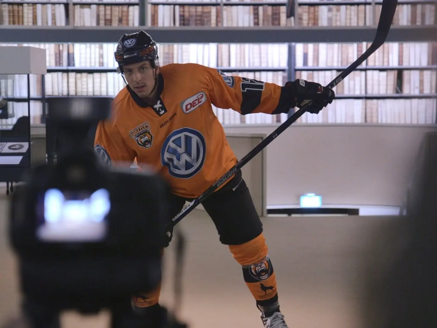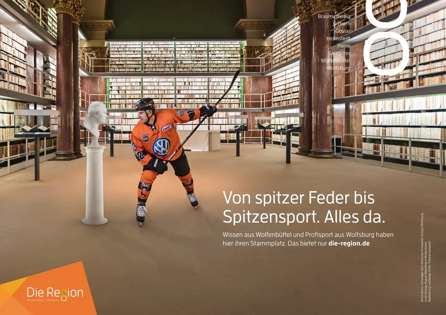 Auf unserem Kampagnenmotiv „Von spitzer Feder bis Spitzensport. Alles da.“ treffen Welten aufeinander: Die des Spitzensports und die der historischen Forschung. Zu sehen ist Armin Wurm, Verteidiger mit der Nummer 12 des Eishockey Erstligisten Grizzlys Wolfsburg neben einer Büste des Dichters Lessing in der ehrwürdigen Wolfenbütteler Herzog August Bibliothek. Und dennoch: Auch auf diesem Motiv können wir Brücken zwischen den Welten schlagen: Auf dem Eis trifft der Grizzly Armin auf die Tiger, die Haie oder die Eisbären. In der Wolfenbütteler Forschungsbibliothek traf er auf Heinrich den Löwen oder auf den schlauen Fuchs Reineke aus dem Tierepos „Reynke de vos“. Zugegeben: Mehr fällt uns nicht ein.