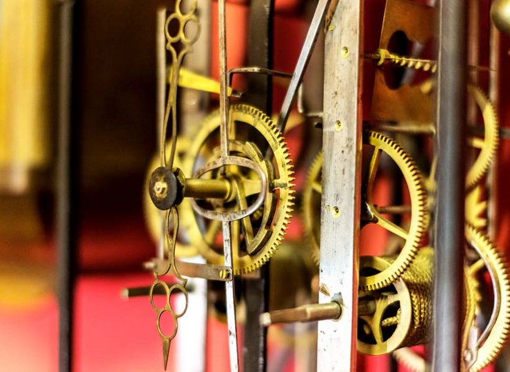 „Bis 1820 wurden die Seiltrommeln der Uhren noch aus Holz gefertigt, erst danach wurde Metall verwendet“, zeigt Wolfgang Langer mir anhand eines ausgebauten Uhrwerks. Die Schnüre, mit denen das Schlagwerk der Uhren betrieben wird, sind bei den antiken Zeitmessern im Original aus (mittlerweile oft brüchigem) Hanf und besitzen eine Bruchfestigkeit von 40 Kilogramm. Wenn er sie restauriert, ersetzt der Uhrenspezialist diese Seile heute durch Kunststoffschnüre, deren Bruchfestigkeit um ein Vielfaches besser ist – sie liegt dann bei 160 Kilogramm und die Chronometer können weitere Jahrhunderte schlagen.