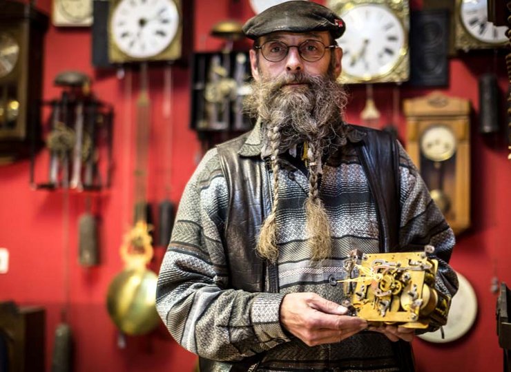 Seine Schätze findet der „halb pensionierte Postler“ auf Flohmärkten, wo er die teilweise defekten Uhren ersteht, um sie in liebevoller Kleinarbeit wieder aufzuarbeiten. Bei manchen Uhren ist nur noch das nackte Uhrwerk vorhanden, er sucht dann nach Zifferblatt und Verzierung (häufig aus Kupferblech gefertigt), baut Pendel und ersetzt defekte Teile.
